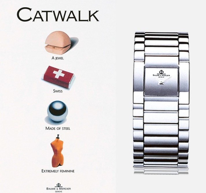 充满青春气息的时尚女士腕表Catwalk系列以 "既是手镯,亦是腕表 "的创新理念示人。它重新定义了腕表的设计,在其巅峰时期成为名士在销售额与品牌形象方面的标杆之作。该表款最初采用抛光精钢表链,随后相继推出橡胶或皮革表链版本。在采用黄金材质的装饰时,更是成为了一款珠宝腕表。